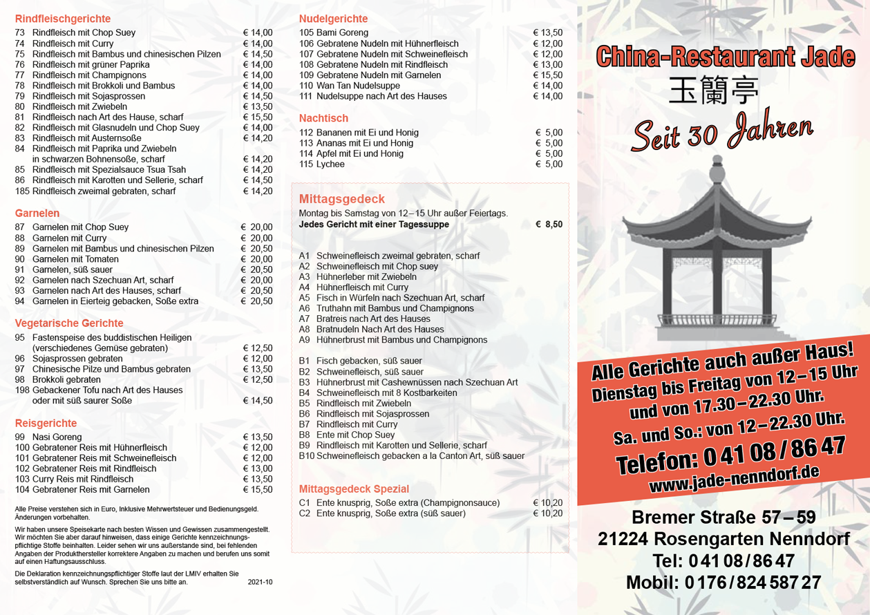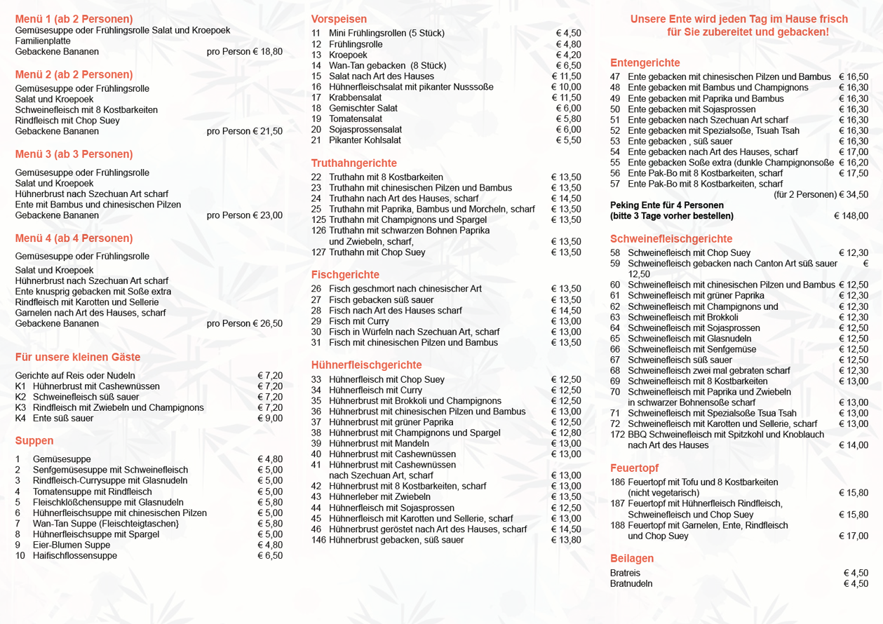 Gemüsesuppe oder Frühlingsrolle Salat und Kroepoek Hühnerbrust nach Szechuan Art scharf Ente knusprig gebacken mit Soße extra Rindfleisch mit Karotten und Sellerie Garnelen nach Art des Hauses, scharf Gebackene Bananen