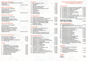 Alle Preise verstehen sich in Euro, Inklusive Mehrwertsteuer und Bedienungsgeld. Änderungen vorbehalten. Wir haben unsere Speisekarte nach besten Wissen und Gewissen zusammengestellt. Wir möchten Sie aber darauf hinweisen, dass einige Gerichte kennzeichnungspflichtige Stoffe beinhalten. Leider sehen wir uns außerstande sind, bei fehlenden Angaben der Produkthersteller korrektere Angaben zu machen und berufen uns somit auf einen Haftungsausschluss. Die Deklaration kennzeichnungspflichtiger Stoffe laut der LMIV erhalten Sie selbstverständlich auf Wunsch. Sprechen Sie uns bitte an.